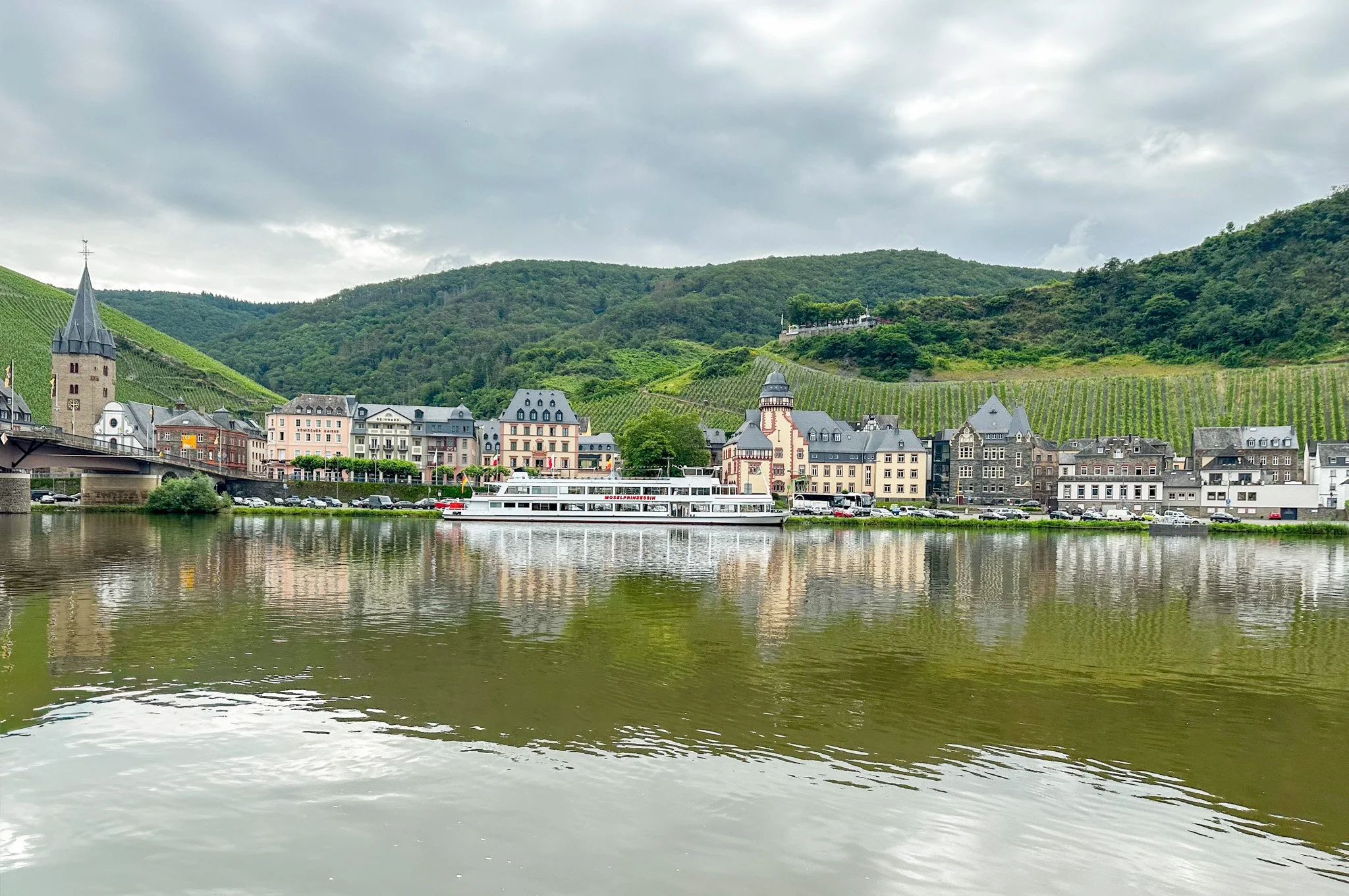 A river ship sailing past vineyards or a charming European village.
